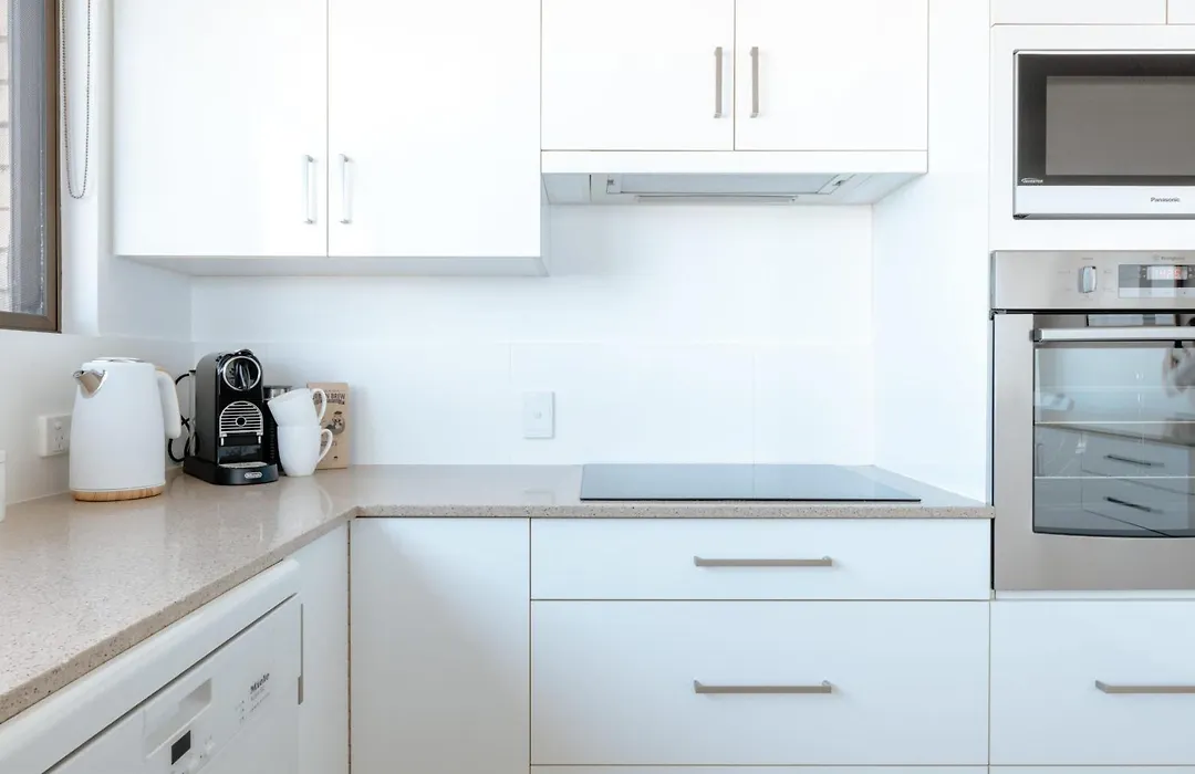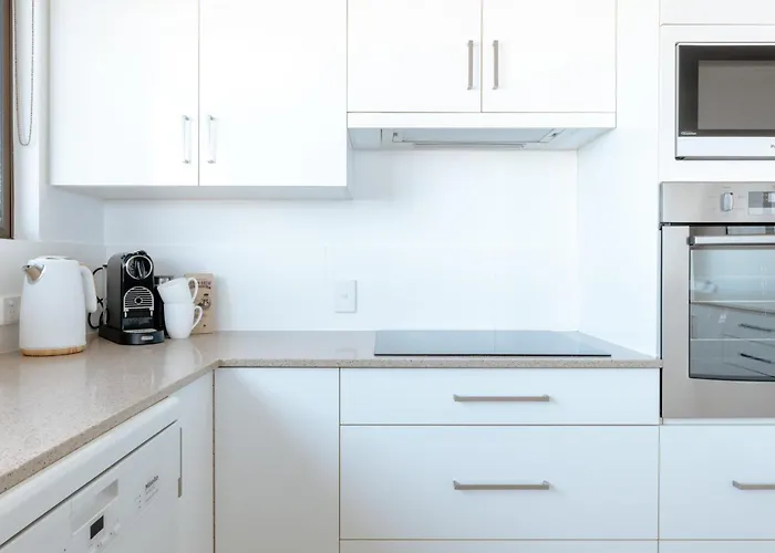 A fully furnished kitchen features coffee and tea making facilities, along with a microwave, a fridge, and kitchenware for self-catering purposes. The apartment is within easy walking distance of the nearest bus stop Moreton Parade at Saltair Street.